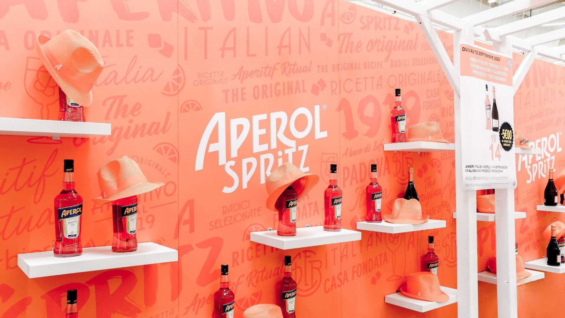 Réaliser un espace de visibilité qualitatif au cœur du magasin. En offrant aux consommateurs une expérience en point de vente avec un stand de dégustation ainsi qu’un espace détente aux couleurs d’Aperol. Tout en respectant les contraintes techniques liées au lieu.