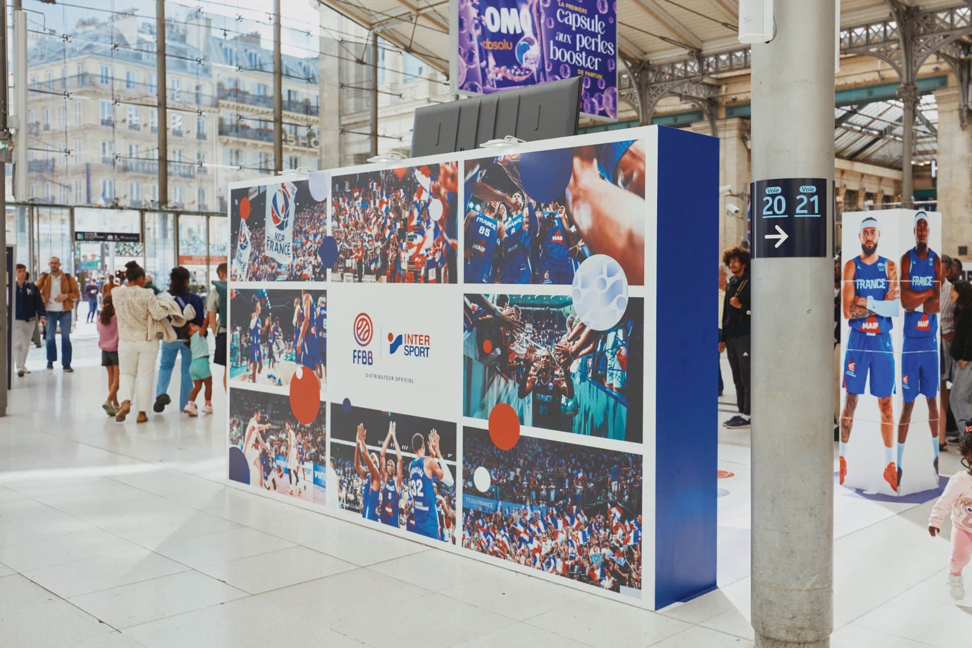 📢 Une signalétique impactante, pensée pour se détacher du bruit ambiant de la gare, visible à distance, en cohérence avec la charte graphique INTERSPORT et les codes visuels du Championnat d’Europe.